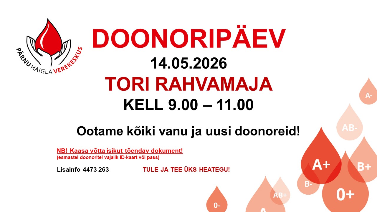 Doonoripäev Tori Rahvamajas 14. mail kell 9.00-11.00 Kuupäev 14 mai 2026 Kellaaeg 09:00 - 11:00 Piirkond Tori Asukoht Tori rahvamaja Võlli tee 4, Tori alevik Teemad Doonoripäev Jaga