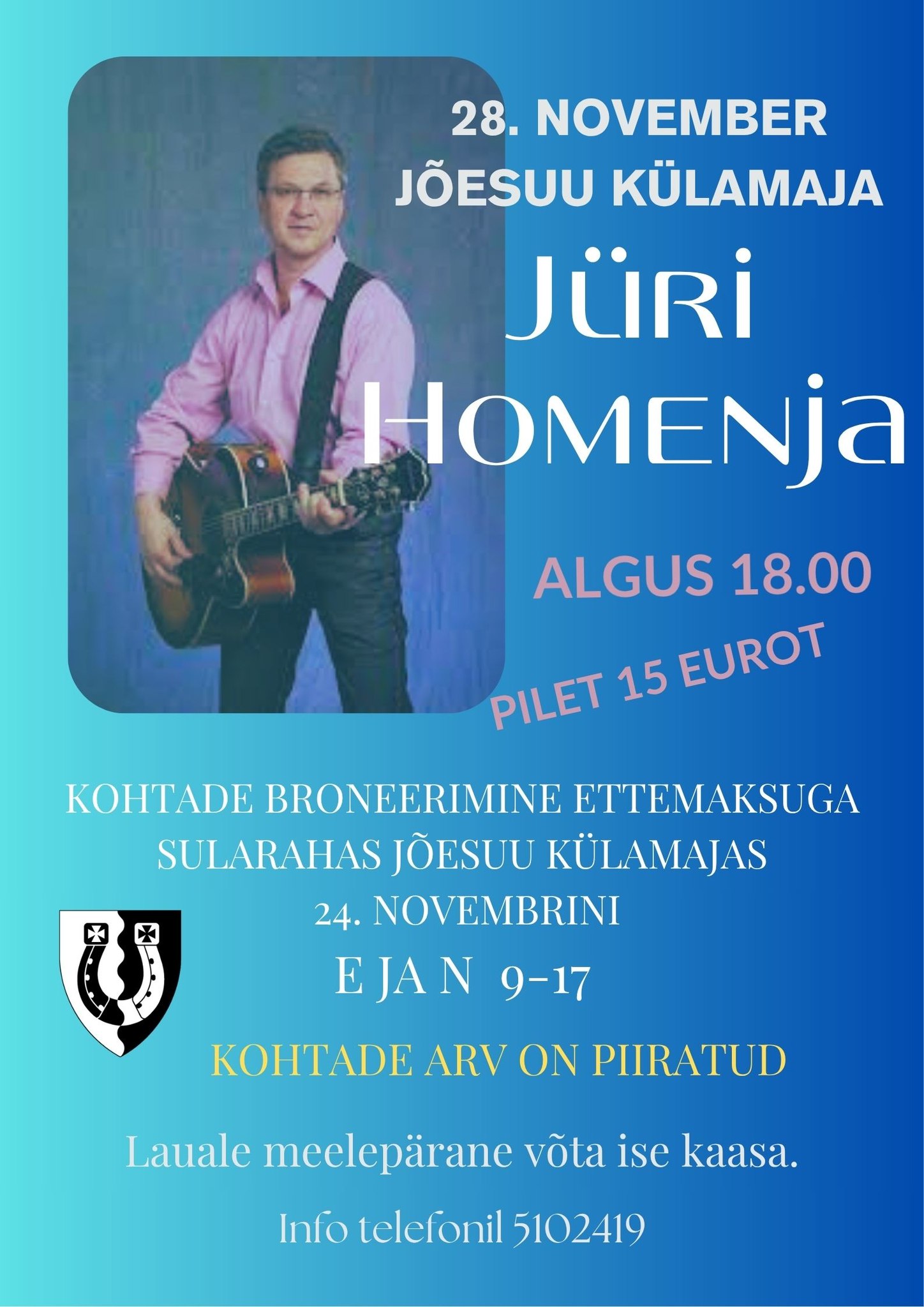 Jüri Homenja // Jõesuu külamajas Kuupäev 28 nov. 2025 Kellaaeg 18:00 Pilet 15 € Piirkond Mujal Asukoht Jõesuu külamaja Teemad Kontsert Pidu Jaga