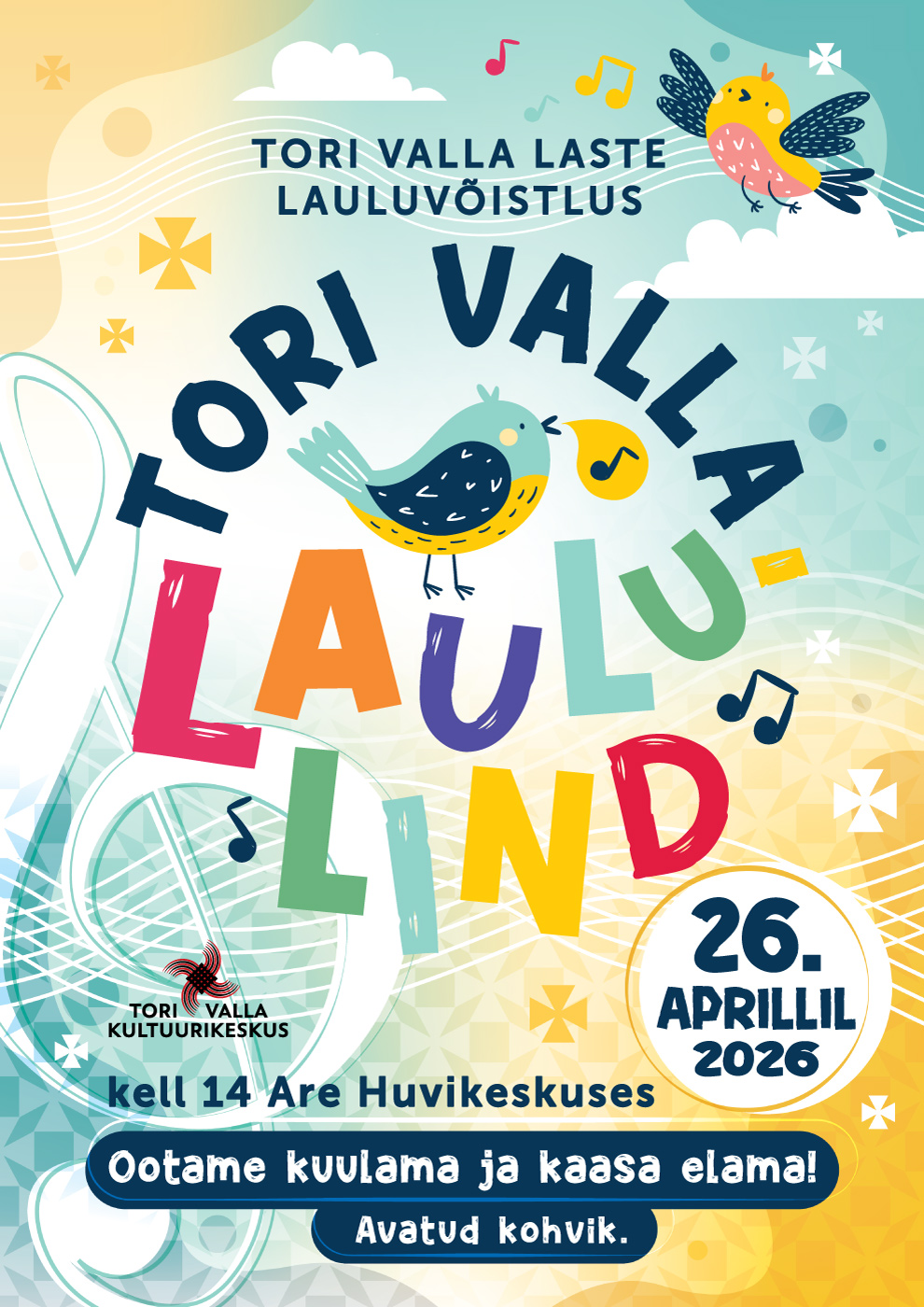 Laulukonkurss “Tori Valla Laululind” 26. aprillil kell 14.00 Are Huvikeskuses. Tule kuulama ja kaasa elama! Kuupäev 26 apr. 2026 Kellaaeg 14:00 Pilet Tasuta Piirkond Are Asukoht Are huvikeskus Pärivere tee 17, Are alevik Teemad Laulukonkurss Jaga
