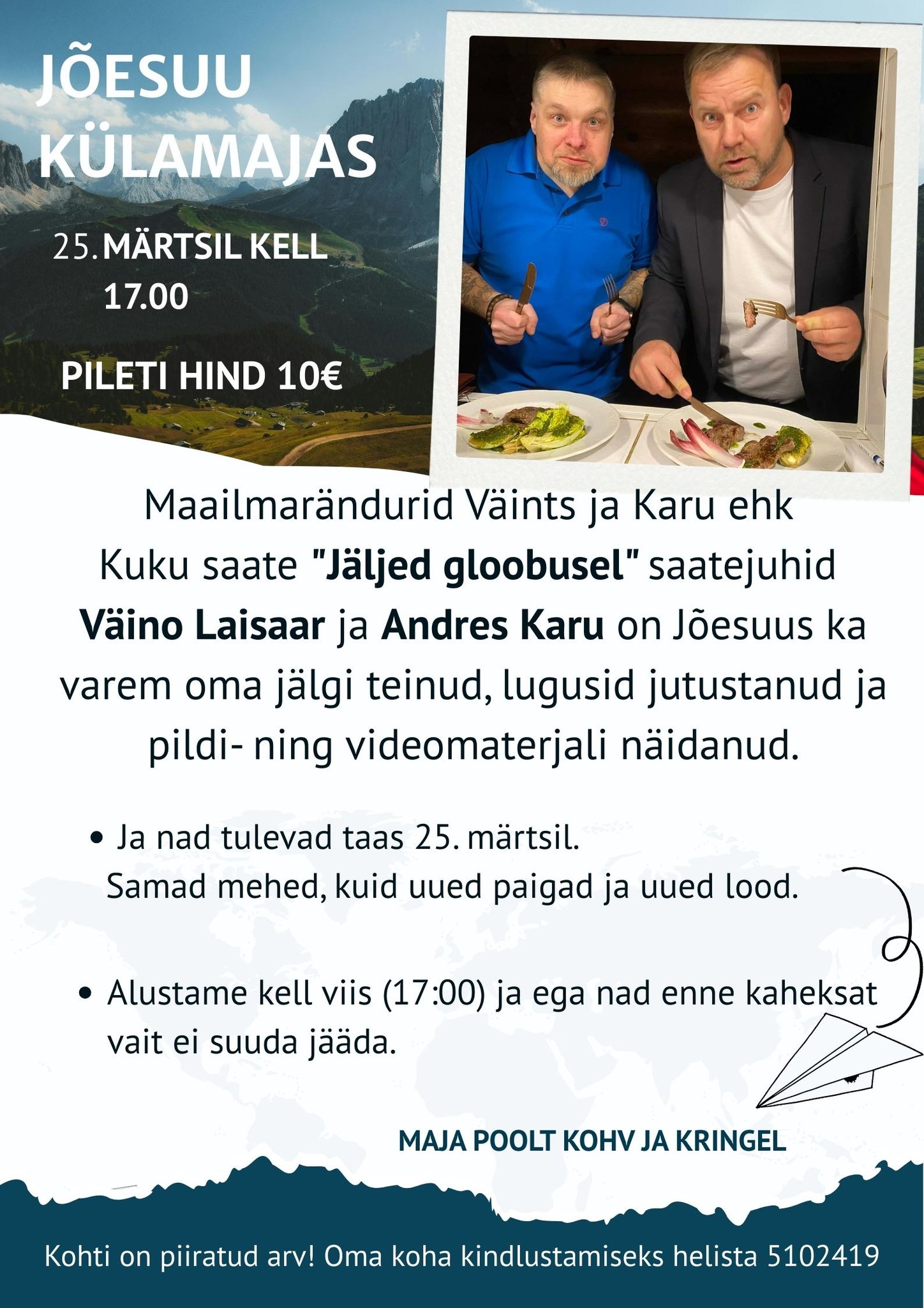 Külla tulevad maailmarändurid Väino Laisaar ja Andres Karu – tuntud ka kui Kuku raadio saate Jäljed gloobusel saatejuhid.